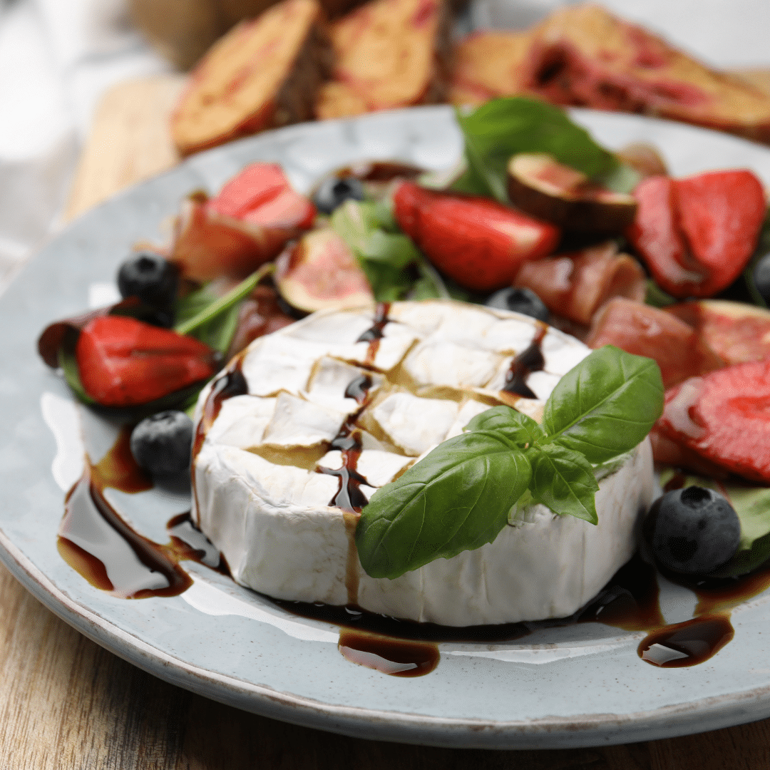 Warm brie topped with balsamic vinegar makes an easy, elegant appetizer. The vinegar adds sweetness and depth that balance the creaminess of the cheese. It’s simple enough for a snack, yet refined enough for a charcuterie board.