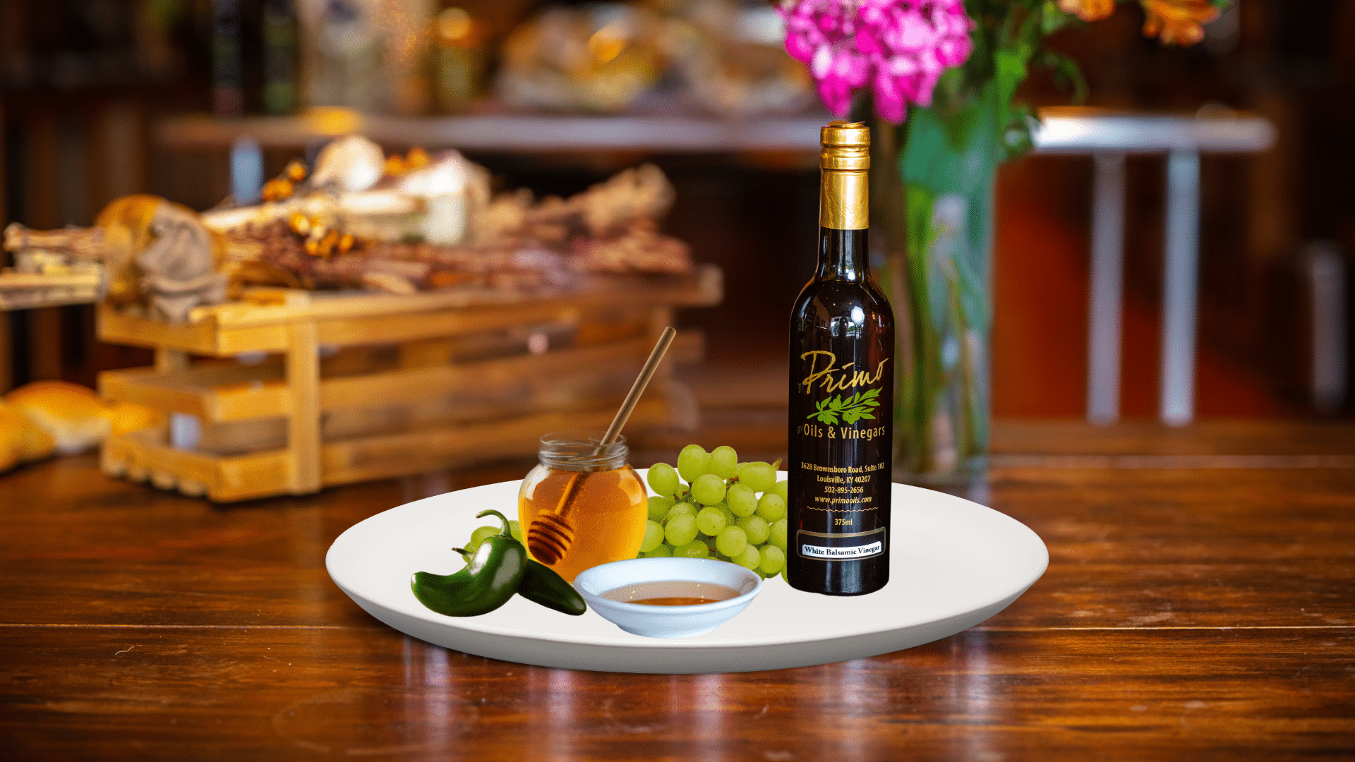 The Serrano Honey White Balsamic Vinegar is made from 100% honey. It’s sweet, spicy, and tart! Try it on a salsa, bloody Mary, and shrimp.